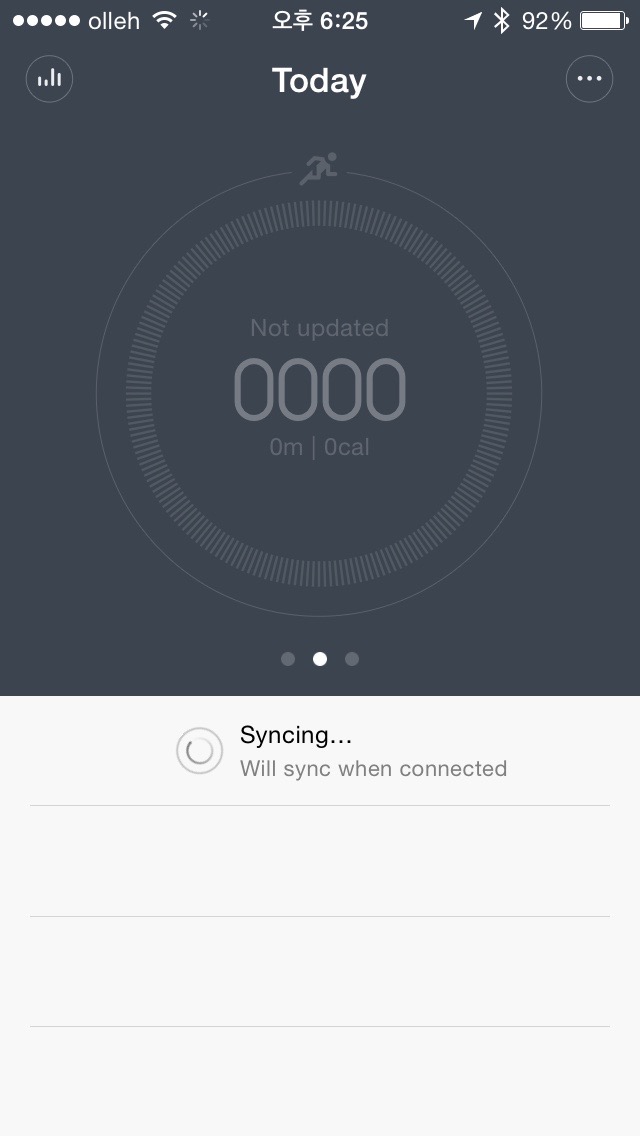 아마 시각적인 만족감을 준 가장 큰 원인은 화면의 절반 이상을 차지하는 원형 그래프 때문일 것이다. 시원한 블루 계열 백그라운드 컬러와 큼지막하게 보이는 숫자가 그렇다. (눈치챘겠지만 Misfit Shine 앱과 매우 유사하다.) 하지만 데이터가 싱크되기 전 화면이나, 싱크 이후에 나타나는 액티비티 리스트는 도통 눈이 가질 않는다. 정말이지 1743이라고 쓰여진 걸음 수 단 하나만을 확인하기 위한 앱이다.