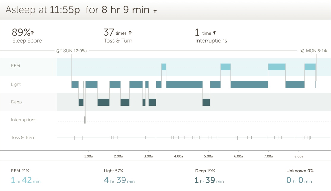 피트니스 밴드를 착용하면서 가장 아쉬웠던 부분이다. 수면을 측정해준다고 얘기하면서, 잠 들기전에 ‘나 잔다’고 선언해주지 않으면 제대로 인식하지 못한다. 30분 이상 오차가 나는 것은 기본이고, 아예 데이터를 불러오지 못하는 경우가 많다. Basis를 착용한 첫 날부터 가장 강력하다고 느낀 부분은 여기에 있다. 가속도 센서 말고도, 체온/심박을 측정할 수 있기 때문에 언제 잠드는지 매우 정확하게 기록한다. (‘움직임을 보니 잠든거 같기도 한데’라고 판단하지 않고, ‘넌 잠들었어’라고 말하는거다.) 당연히 언제 일어났는지도 꽤나 정확하다.