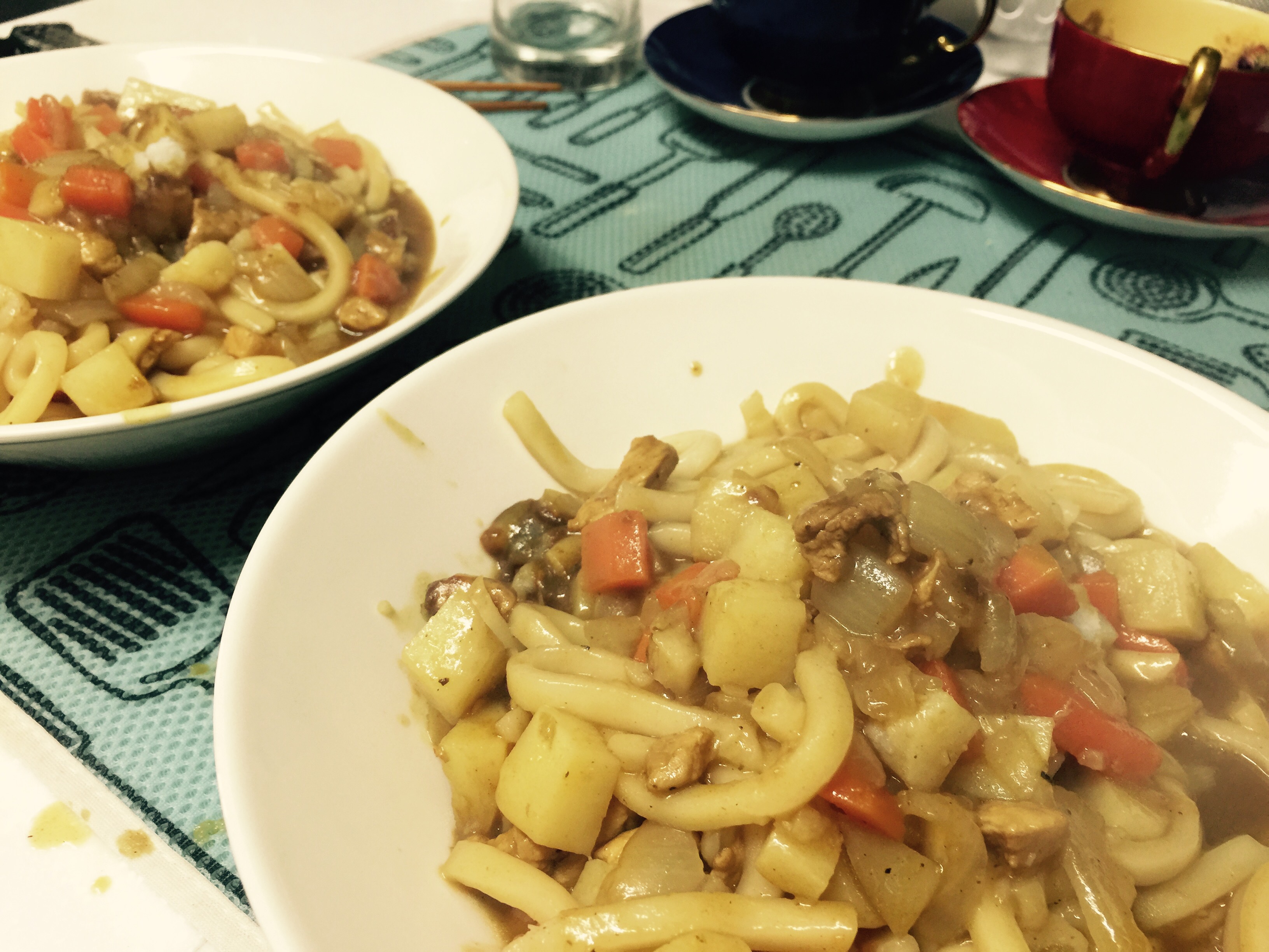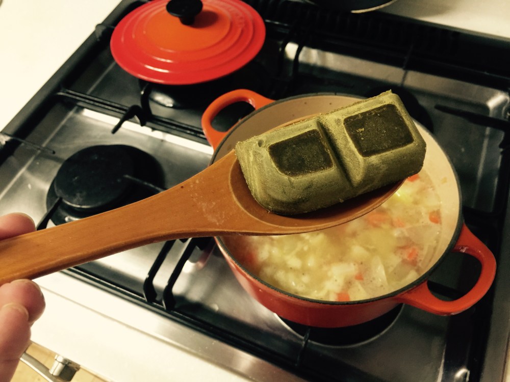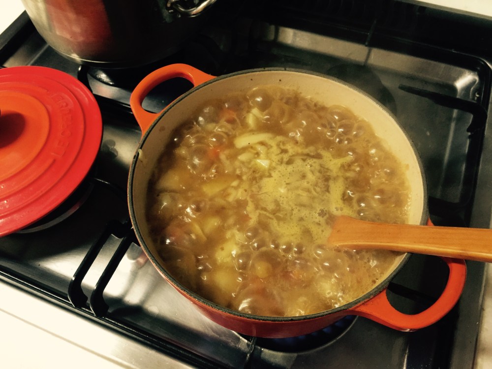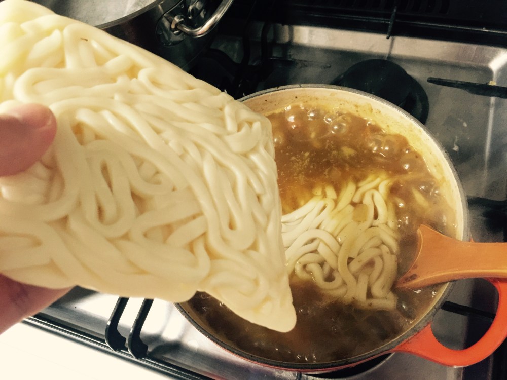 - 좀 끓어갈 때 카레 블럭을 두 개 정도 넣고, 다 됐다 싶을 때 우동면 넣으면 됩니다.