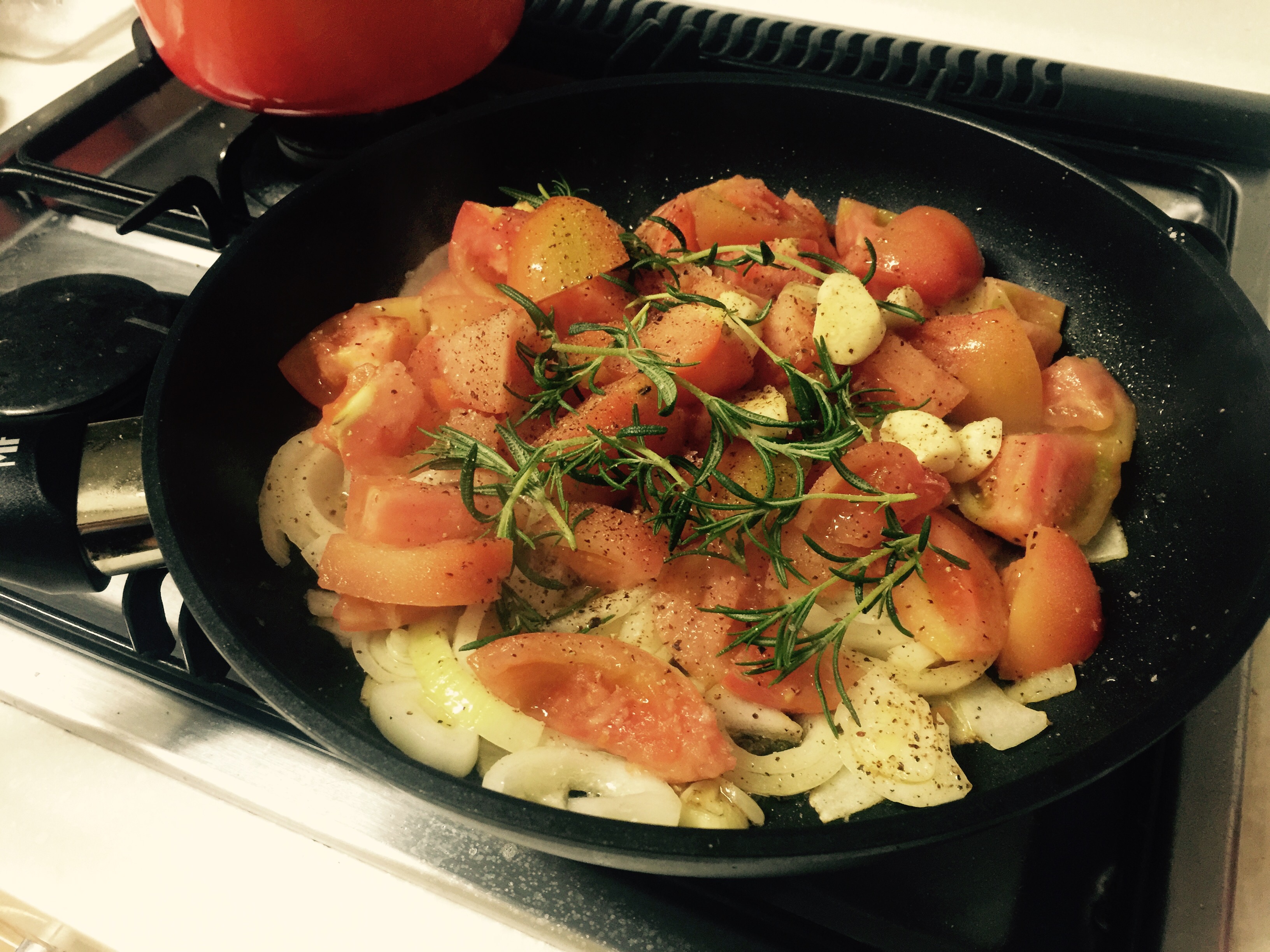 • 올리브유에 양파를 볶다가 토마토, 마늘 넣고 10분 정도 더 볶음