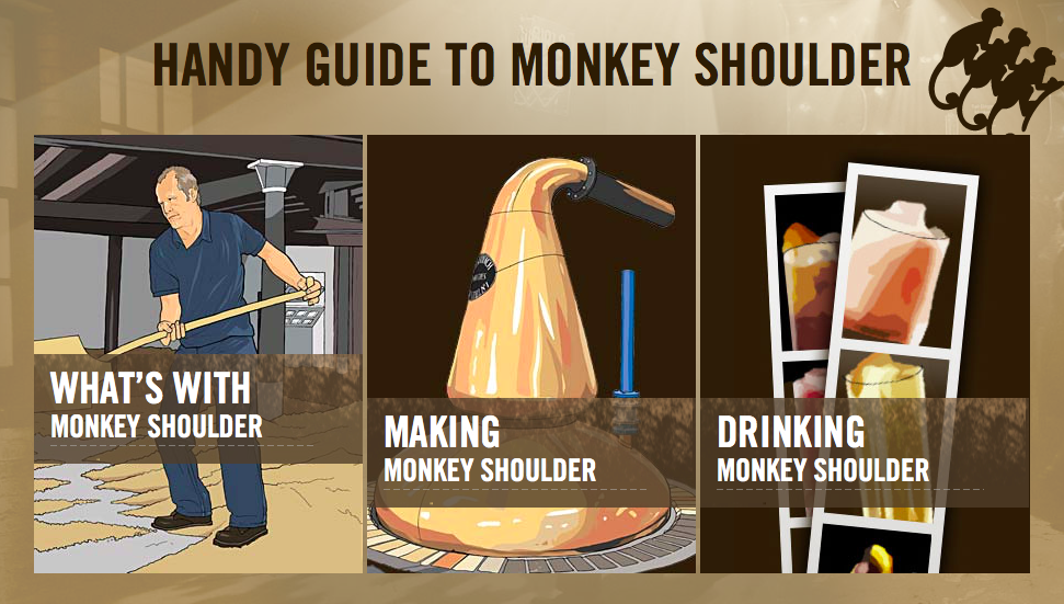 몽키 숄더는 뭘까 궁금했다. (구글 검색하면 다 나온다.) 위스키를 제조하는 과정에서 몰트를 건조시키는데, 예전에는 (또는 발베니 같은 몇몇 증류소에서는) 삽을 든 ‘몰트맨’들이 직접 뒤집는다. 대부분은 당연히 기계로 한다. 이 과정을 업으로 삼는 ‘몰트맨’들은 어깨가 쳐지는 일종의 직업병을 얻게되는데, 그 모습이 원숭이의 어깨 같다고 붙여진 이름이다. 즉, 몽키숄더는 이들을 기리기 위한 네이밍이다. 비교적 최근인 2005년 출시되었다. 그리고 병목에는 Batch 27이라는 스티커가 붙어있다. 27은 캐스크 번호다. 대부분의 위스키 브랜드는 자사의 사이트를 통해 브랜드에 대한 소개, 역사, 어울리는 칵테일 등을 친절히 알려준다.