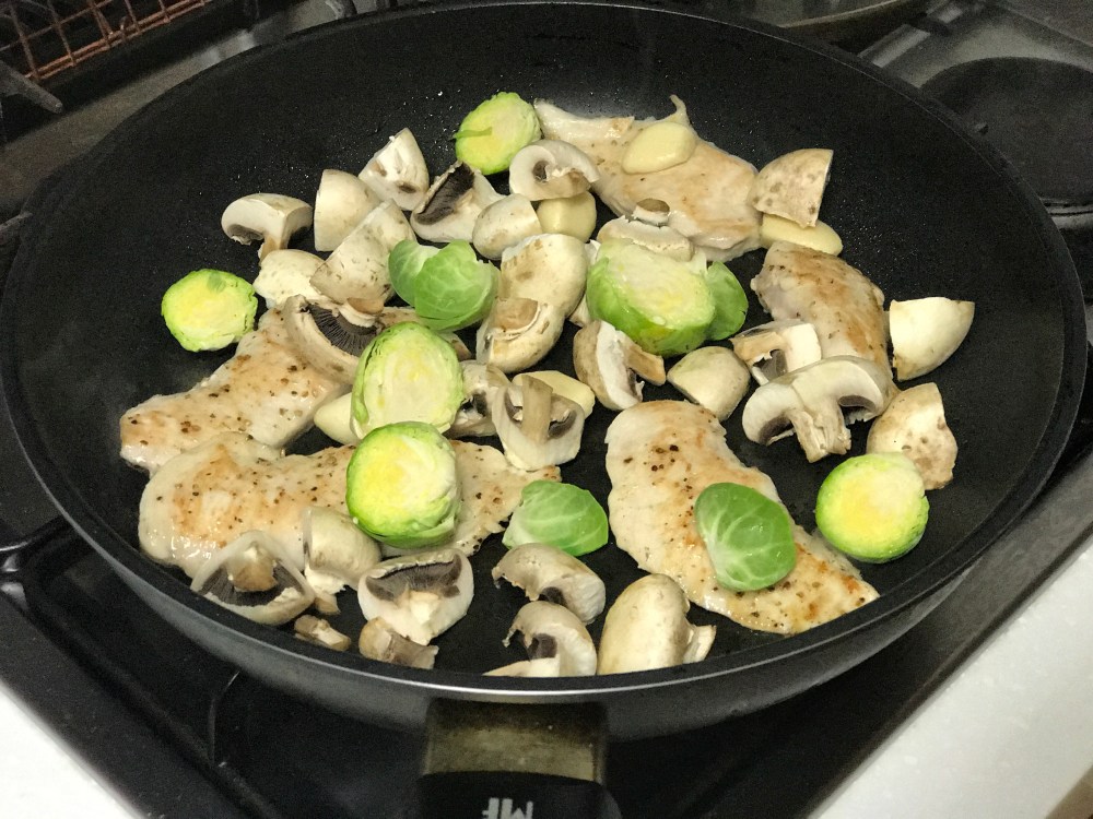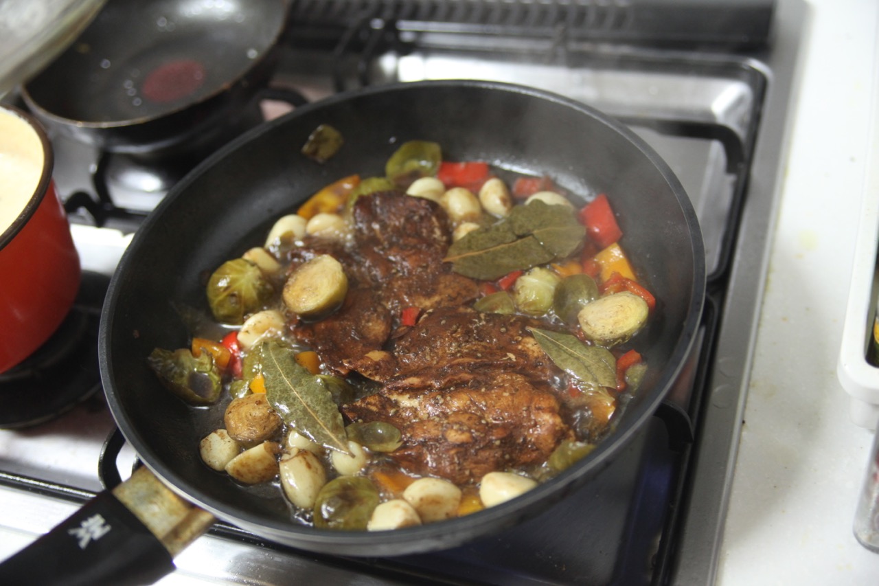 - 야채를 넣고, 닭육수(치킨스탁)에 발사믹을 넣고 같이 졸인다. 야채는 양송이 버섯, 미니 양배추, 마늘 정도가 좋다. 냉장고에 있는것을 넣으면 된다.