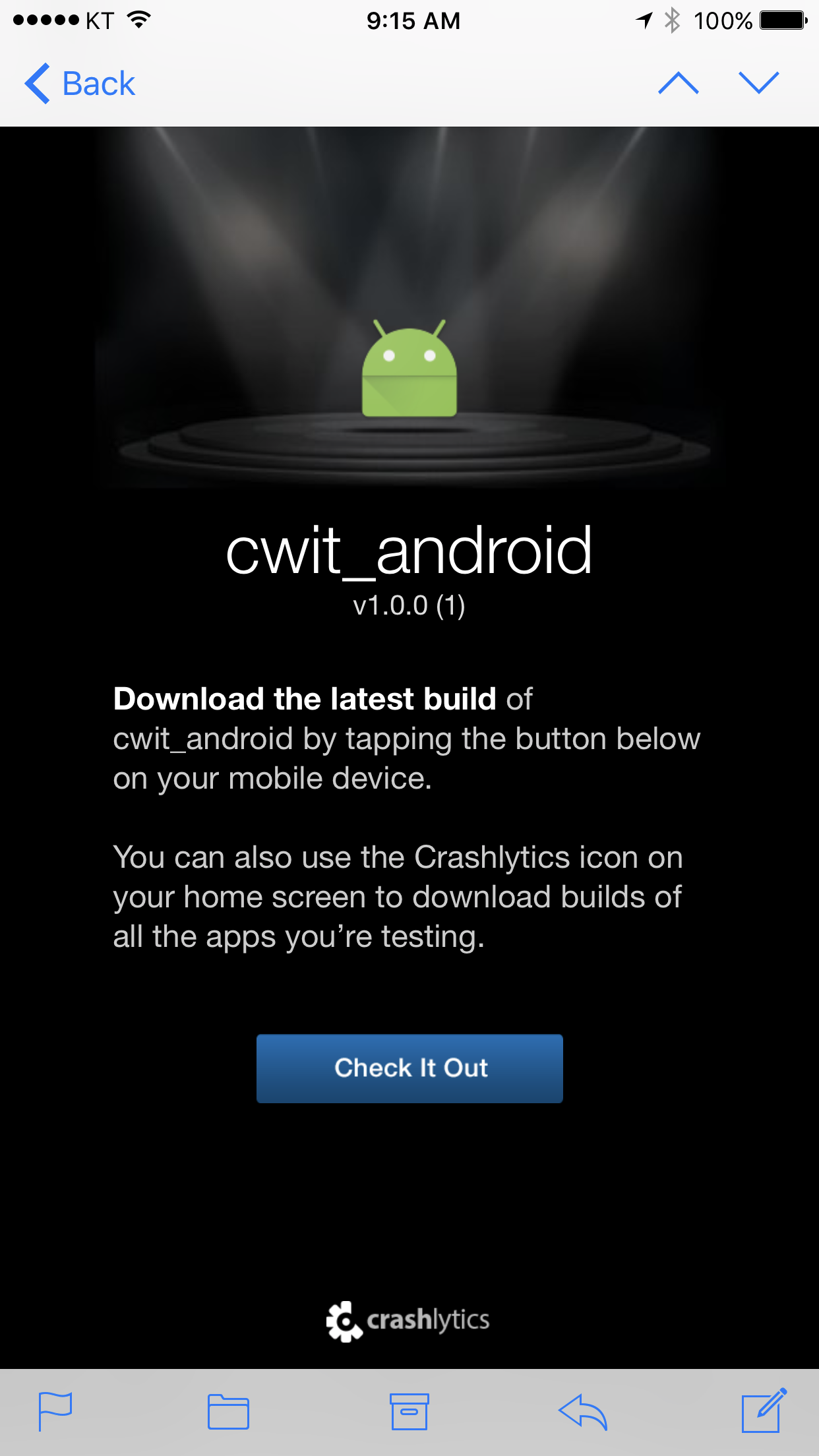 - 테스터로 지정된 사람들은 Crashlytics에서 발송된 이메일을 받게된다. 이 이메일을 연다.