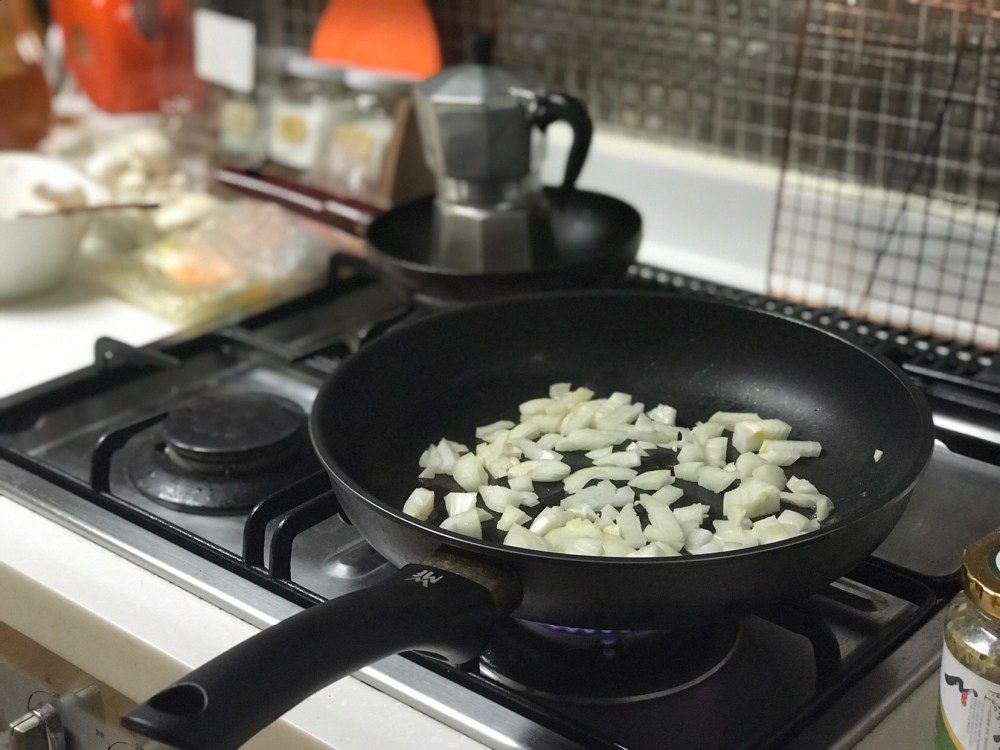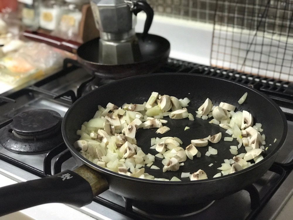 - 양파를 버터에 먼저 볶은 후 버섯을 잘게 썰어 넣는다.